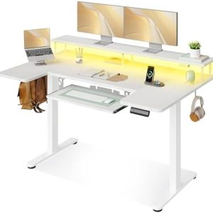 **OffiGo U Shaped Electric Standing Desk with Keyboard Tray – 55 Inch Height Adjustable Desk** Elevate your workspace with the OffiGo U Shaped Electric Standing Desk, designed to enhance productivity and comfort in any home or office environment. This versatile desk features a modern, sleek design in a clean white finish, making it a stylish addition to your office setup. **Key Features:** – **Height Adjustable:** Effortlessly transition between sitting and standing positions with the electric height adjustment feature. With a range of 28 to 48 inches, you can customize your desk to your ideal height for maximum comfort. – **Spacious Work Surface:** The generous 55-inch U-shaped design provides ample space for multiple monitors, documents, and other essential work tools. Keep your workspace organized and clutter-free. – **Integrated Keyboard Tray:** The included keyboard tray offers a dedicated space for your keyboard and mouse, allowing for a more ergonomic typing position and a cleaner desk surface. – **Power Outlets & USB Ports:** Stay connected and powered up with built-in power outlets and USB ports. Charge your devices conveniently without the hassle of searching for an available socket. – **LED Lighting:** Enhance your workspace ambiance with integrated LED lights that not only provide functional illumination but also add a modern touch to your desk. – **Sturdy and Durable Construction:** Built with high-quality materials, the OffiGo desk is designed to withstand daily use while providing stability and durability. **Why Choose OffiGo?** The OffiGo U Shaped Electric Standing Desk is perfect for professionals, students, and anyone seeking a healthier work environment. Its combination of functionality, style, and advanced features makes it an ideal choice for those looking to upgrade their workspace. Whether you’re working from home or at the office, this desk helps promote better posture, reduce fatigue, and enhance productivity. Transform your workspace today with the OffiGo U Shaped Electric Standing Desk and experience the perfect blend of comfort and efficiency! **Specifications:** – Dimensions: 55″ W x 28″ D x 28-48″ H – Material: High-quality engineered wood and steel – Color: White – Assembly: Some assembly required **Order Now!** Don’t miss out on the opportunity to improve your workspace. Click “Add to Cart” and start your journey towards a more productive and healthier work life with OffiGo!